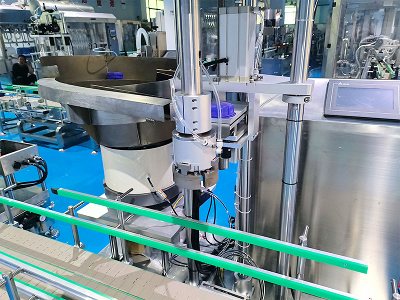直線式稱重灌裝生產(chǎn)主要由PLC控制系統(tǒng)逐一調(diào)度生產(chǎn)模式,其中的各個環(huán)節(jié)都通過傳感器與執(zhí)行器實現(xiàn)無縫銜接的灌裝優(yōu)勢,工人將所需灌裝的容器放置在輸送帶上,輸送裝置將容器分布送至各個灌裝工位的灌裝頭下方,光電感應(yīng)控制則會實時檢測容器口位置,并將其固定,伺服電機則會精準的控制灌裝頭的位置標準,在進入灌裝區(qū)域后,直線式稱重灌裝生產(chǎn)線的PLC啟動灌裝閥,由此開始進行先快加后慢加的工作條件,在達到設(shè)定的重量后,灌裝閥自動關(guān)閉,完成生產(chǎn)任務(wù),隨后上蓋機將會跟隨容器位置進行自動上蓋、旋轉(zhuǎn)扭矩將其旋緊的工作狀態(tài)。