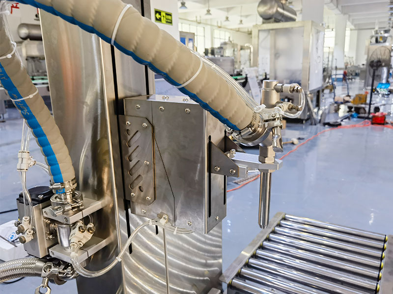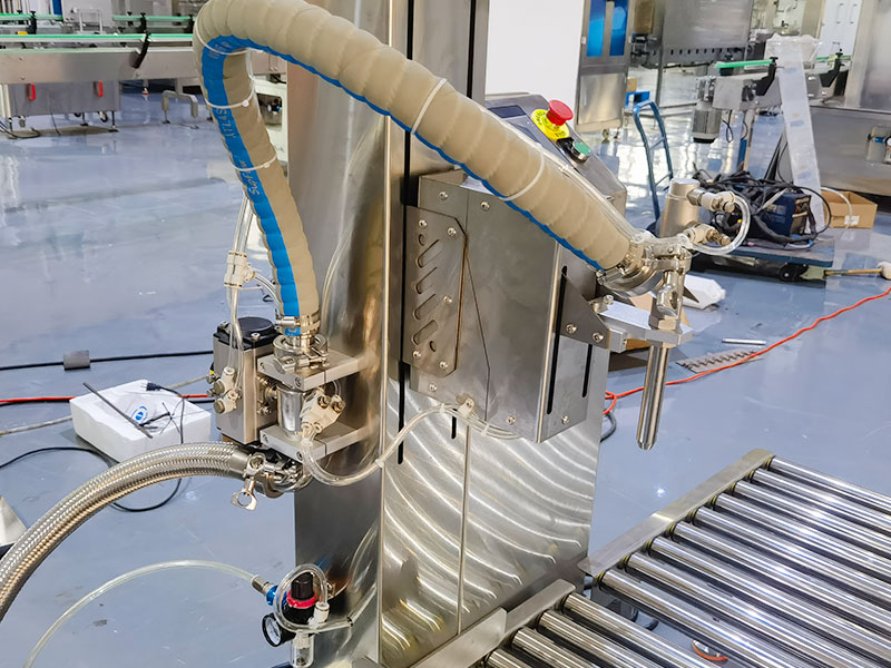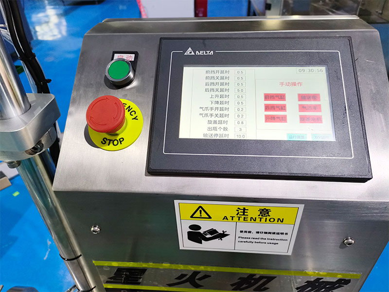 大型化工液體灌裝設(shè)備主要由自動(dòng)化控制系統(tǒng)執(zhí)行,工作人員將空桶防止在輸送帶上,開(kāi)啟綠色灌裝按鈕,光電傳感裝置在檢測(cè)到灌裝桶到位時(shí),氣動(dòng)夾具自動(dòng)夾緊,系統(tǒng)開(kāi)始自動(dòng)扣除空桶重量,進(jìn)行去皮處理,大型化工液體灌裝設(shè)備將會(huì)進(jìn)入灌裝準(zhǔn)備狀態(tài),灌裝頭開(kāi)始插入容器桶內(nèi),打開(kāi)防爆電磁閥,物料順著流入桶內(nèi),稱(chēng)重感應(yīng)裝置將實(shí)時(shí)反饋重量信息的變化,便于工作人員查詢(xún),PLC控制閥門(mén)將會(huì)實(shí)現(xiàn)快、慢速切換模式,以此達(dá)到灌裝精度的準(zhǔn)確,充填結(jié)束后,閥門(mén)關(guān)閉,灌裝頭回吸并提升,隨之進(jìn)入旋蓋工位,振動(dòng)盤(pán)則把需要封蓋的容器逐一上蓋,機(jī)械臂抓蓋,伺服旋蓋頭將按預(yù)設(shè)扭矩完成旋蓋任務(wù)。
