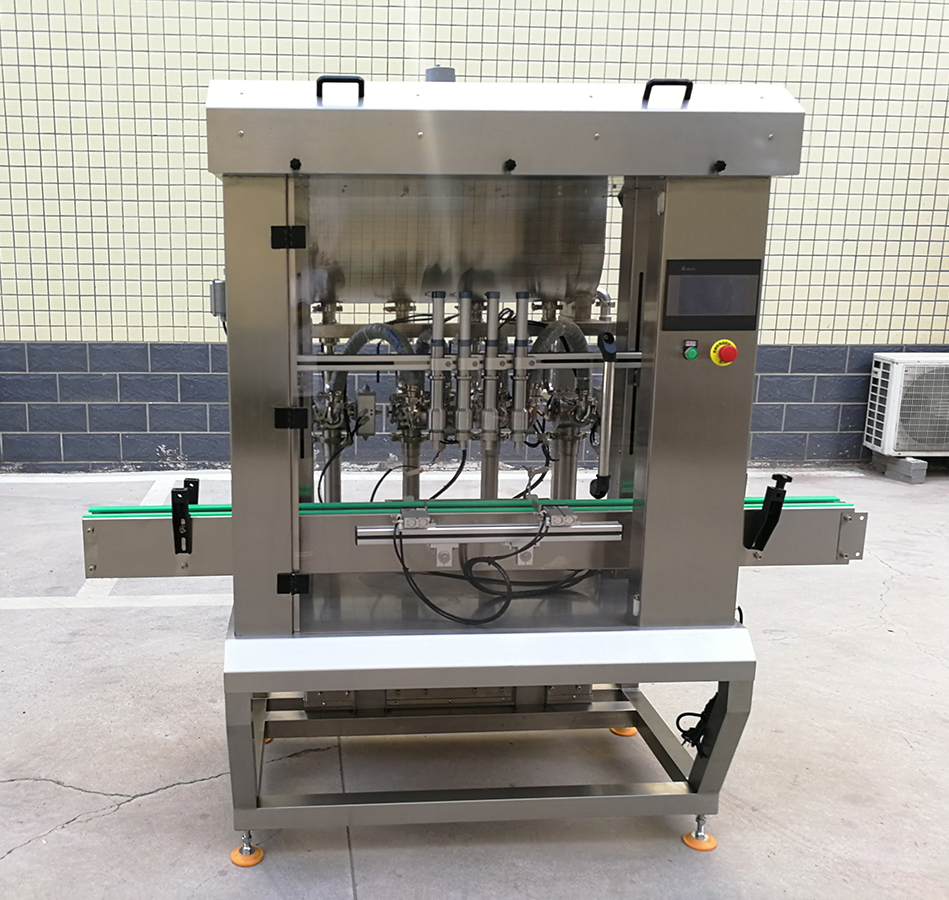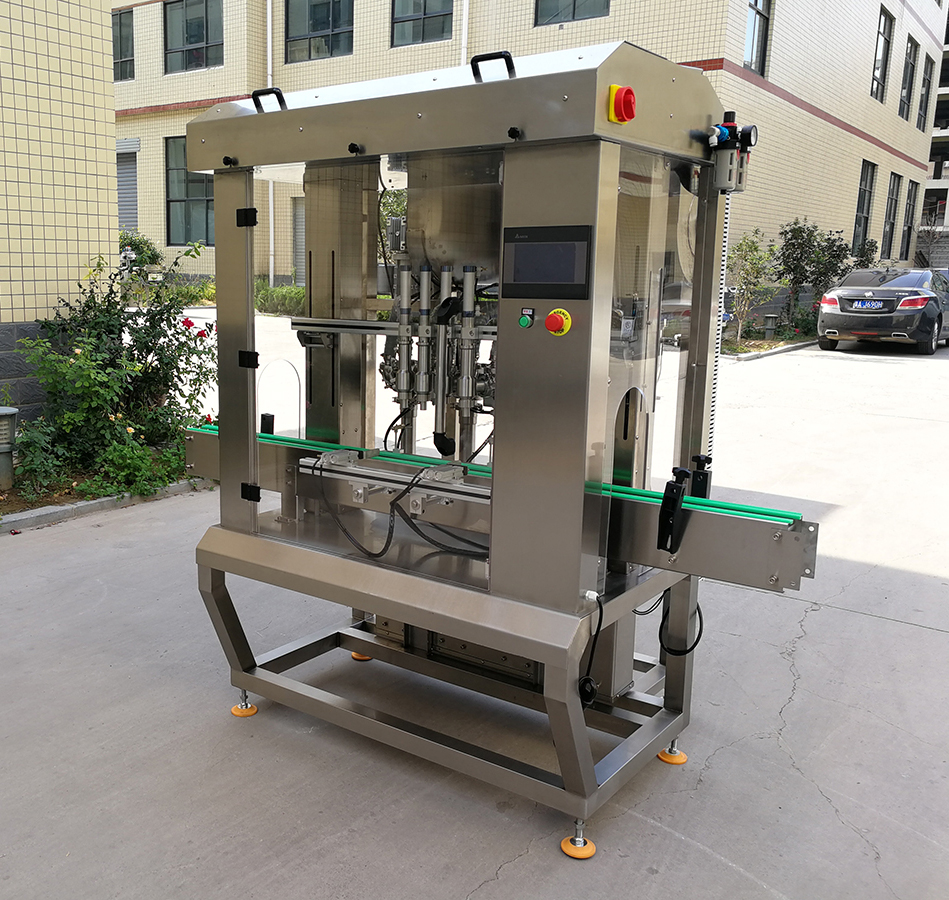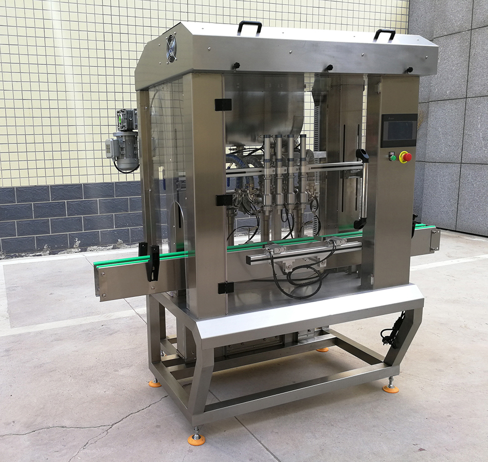 是我司新款的4頭醬料灌裝機,設計新穎、外形美觀,具有界面友好,適應性強、操作簡單、灌裝量準確,維護方便等特點。設備表面和物料按觸面均采用304不銹鋼材料制造,無滴漏,無拉絲,易清洗,完全符合食品行業(yè)標準要求。